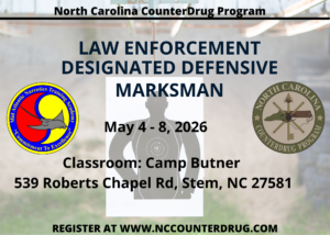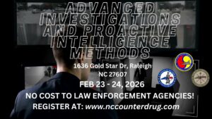 Location: NCNG Joint Force Headquarters Auditorium: 1636 Gold Star Dr, Raleigh NC 27607 Time: Feb 23 – 24 2026 | 8am – 5pm Fee: There is no fee for this training Meals: Agency / Individual responsibility Lodging: Agency / Individual responsibility Designed For: Sworn Law Enforcement Officers Prerequisites: Students must be sworn law enforcement officers or currently (more…)